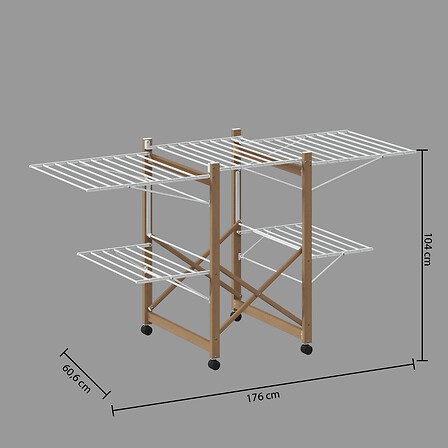 Etendoir extensible et pliable. 4 roues pour un déplacement plus facile même chargé. Système de blocage des roues. Se plie et se range facilement. Finition effet bois et blanc. Capacité d'étendage 27 mètres. Tubes qui ne marquent pas le linge. Livré pré monté.