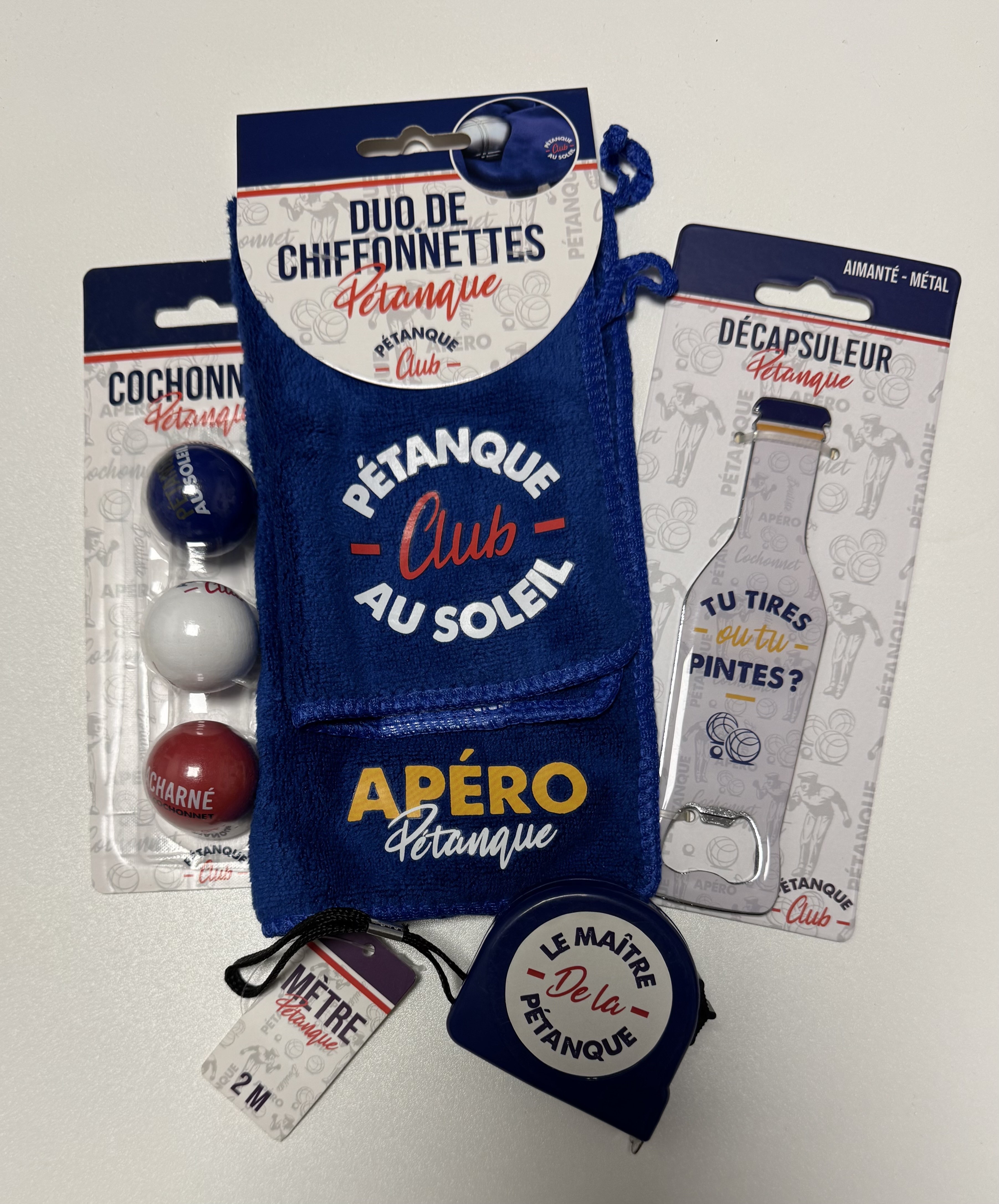 ✔️ Pack de 3 cochonnets “Apéro Pétanque” – indispensable pour débuter une partie. Chaque cochonnet porte un message fun (ex. « Pétanque au soleil », « Pétanque Club », « Acharné du cochonnet »). irisiamaison.fr
