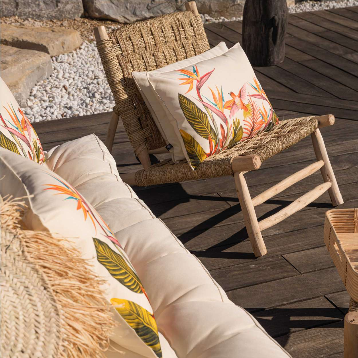 👉 Les motifs tropicaux apportent une atmosphère dynamique et accueillante en extérieur
